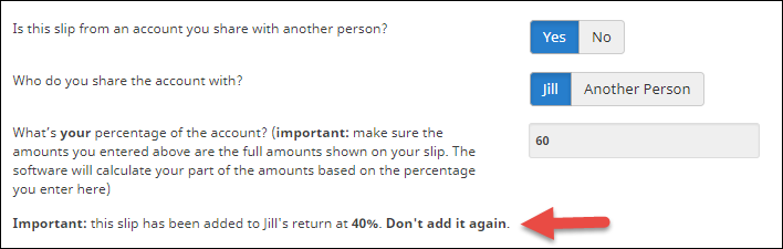If this slip is for an account you hold with another person (joint account), you’ll be able to split this slip with the other person by indicating what percentage of the account is yours. For example, on the T5 page, you’ll see related questions under the Additional information about your slip section.